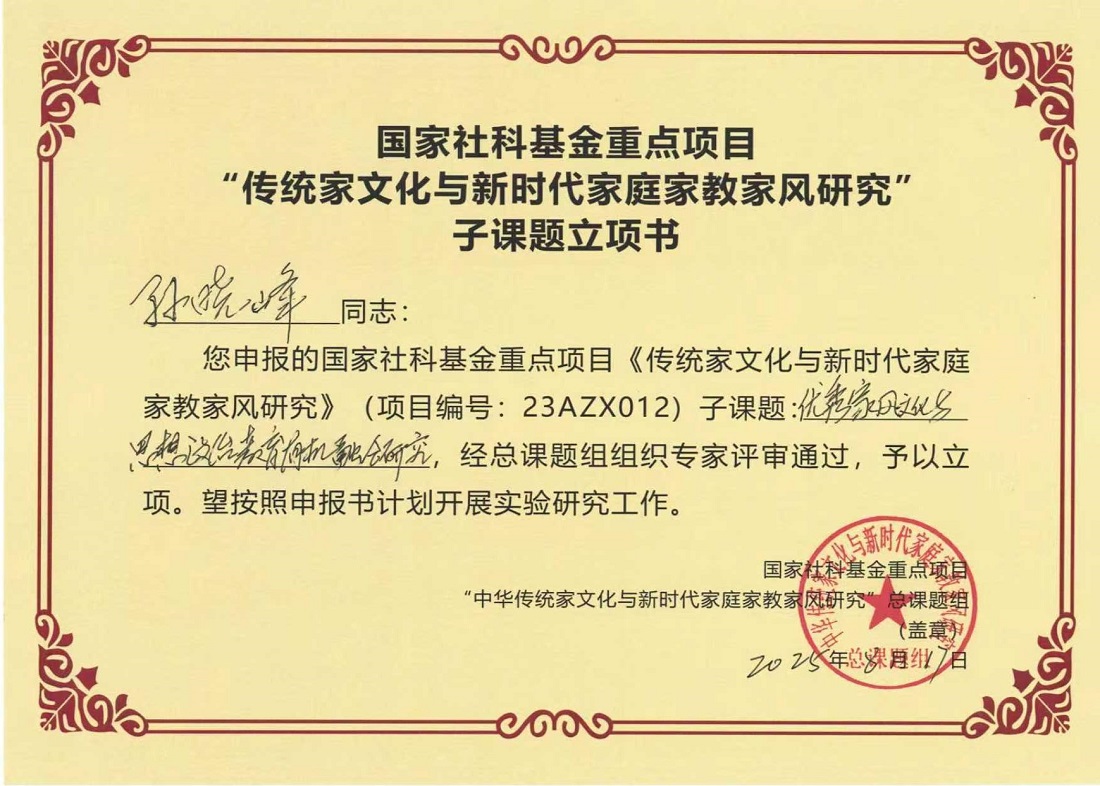 本網(wǎng)訊(通訊員:李彩平)近日,國(guó)家社科基金重點(diǎn)項(xiàng)目《傳統(tǒng)家文化與新時(shí)代家庭家教家風(fēng)研究》召開(kāi)開(kāi)題培訓(xùn)會(huì)。我校大學(xué)生素質(zhì)教育研究中心研究員孫曉峰教授作為子課題負(fù)責(zé)人,申報(bào)的子課題《優(yōu)秀家風(fēng)文化與思想政治教育有機(jī)融合研究》經(jīng)專(zhuān)家組審核,成功獲批立項(xiàng)。