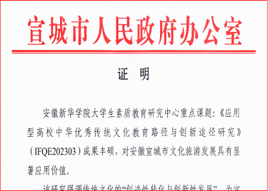 本網(wǎng)訊(通訊員:李平)近日,大學(xué)生素質(zhì)教育研究中心課題《應(yīng)用型高校中華優(yōu)秀傳統(tǒng)文化教育路徑與創(chuàng)新途徑研究》(主持人:李倩)取得豐碩研究成果,其核心對(duì)策與建議已正式被宣城市人民政府采納,標(biāo)志著大學(xué)生素質(zhì)教育研究中心科學(xué)研究在服務(wù)地方文化發(fā)展與教育創(chuàng)新方面取得了突破性進(jìn)展。