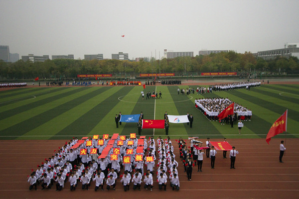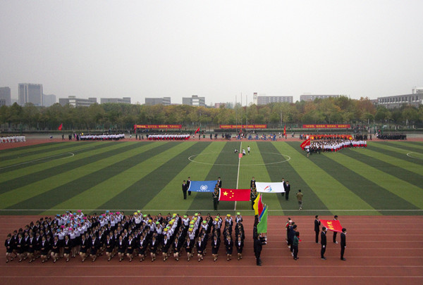 伴隨著激情澎湃的運動員進行曲,氣宇軒昂的護旗隊最先入場,護旗手們高舉國旗、校旗和會旗,踏著整齊劃一、剛勁有力的步伐走過主席臺。由各二級學(xué)院代表組成的方陣依次入場。