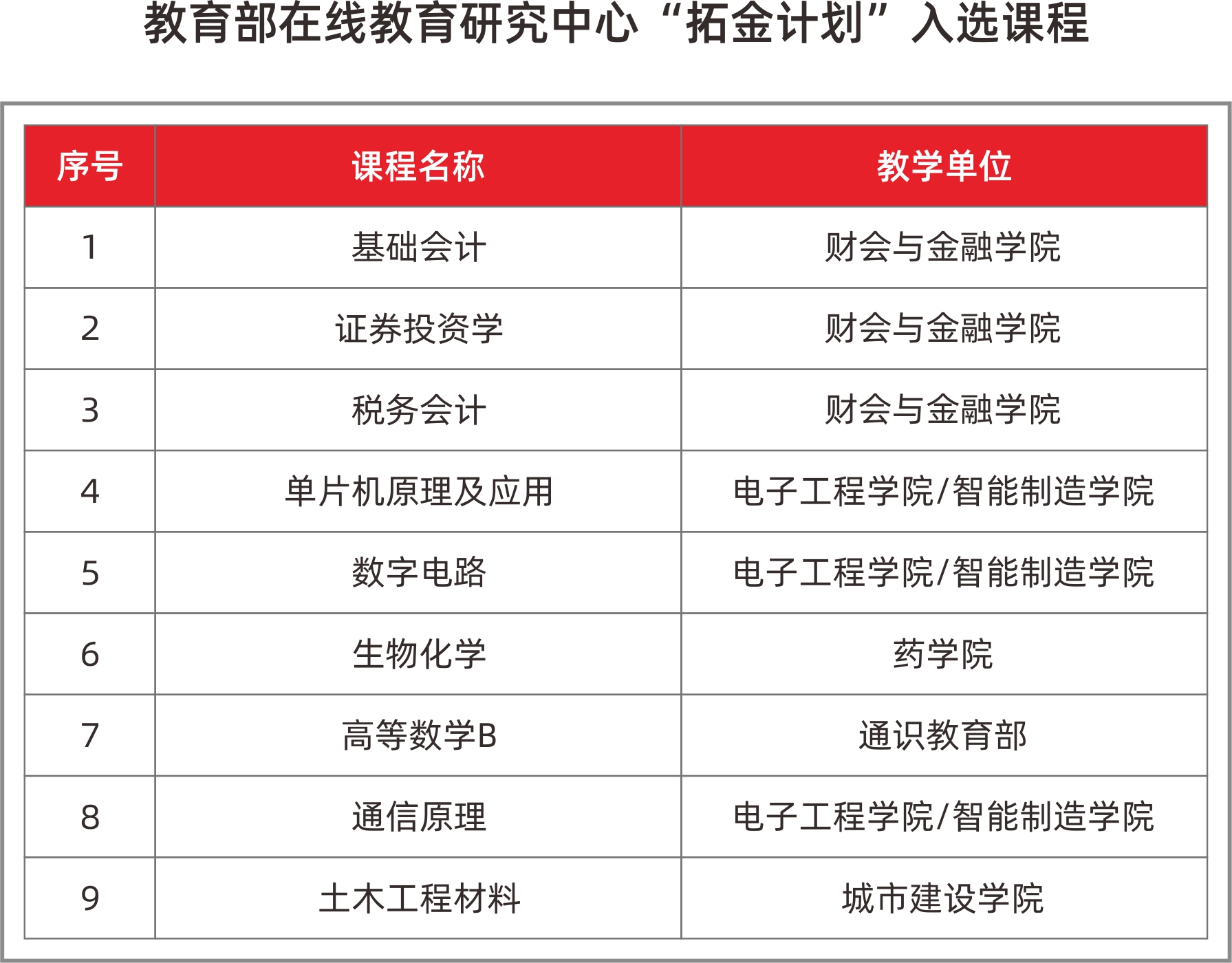 我校制定《關(guān)于深化課程建設(shè)與改革 進(jìn)一步推進(jìn)一流課程建設(shè)的指導(dǎo)意見(jiàn)》,建立“校級(jí)—省級(jí)—國(guó)家級(jí)”三級(jí)一流課程培育機(jī)制。遴選電子工程學(xué)院/智能制造學(xué)院和財(cái)會(huì)與金融學(xué)院作為課程改革試點(diǎn)單位,以點(diǎn)帶面推進(jìn)課程改革。近5年,紀(jì)利琴副教授團(tuán)隊(duì)的《數(shù)字電路》課程獲評(píng)國(guó)家級(jí)一流本科課程。獲批省級(jí)一流本科課程建設(shè)項(xiàng)目80項(xiàng),入選教育部在線教育研究中心“拓金計(jì)劃”課程9門(mén),上線“國(guó)家高等教育智慧教育”平臺(tái)課程10門(mén)。