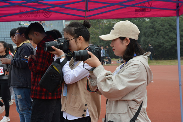 還有一群人,他們帶著相機奔走在操場的各個角落,拍攝下比賽時的精彩瞬間。來自攝影工作室的周文靜說:“在拍攝照片的過程中,拍攝對象不僅有努力比賽的運動員,還有給運動員加油助威的同學(xué)、默默無聞的志愿者、認真判罰的裁判員等等。無數(shù)次的拍攝才能獲取一張滿意的照片,雖然拍攝過程很艱難,但是只要用心總會記錄下一些美好瞬間。”