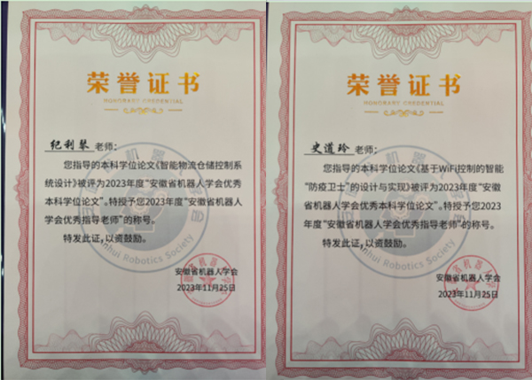 近日,2023年安徽省機器人學會優(yōu)秀碩士學位論文、優(yōu)秀本科畢業(yè)論文(設計)評選結(jié)果揭曉。我校電子工程學院/智能制造學院學子張家樂的畢業(yè)論文《智能物流倉儲控制系統(tǒng)設計》以及楊星卓的畢業(yè)論文《基于WiFi控制的智能“防疫衛(wèi)士”的設計與實現(xiàn)》在與中國科學技術大學、合肥工業(yè)大學、安徽大學等省內(nèi)知名高校同臺比拼中,榮獲2023年安徽省機器人學會優(yōu)秀本科畢業(yè)論文,指導教師紀利琴、史道玲榮獲“2023年安徽省機器人協(xié)會優(yōu)秀指導教師”稱號。