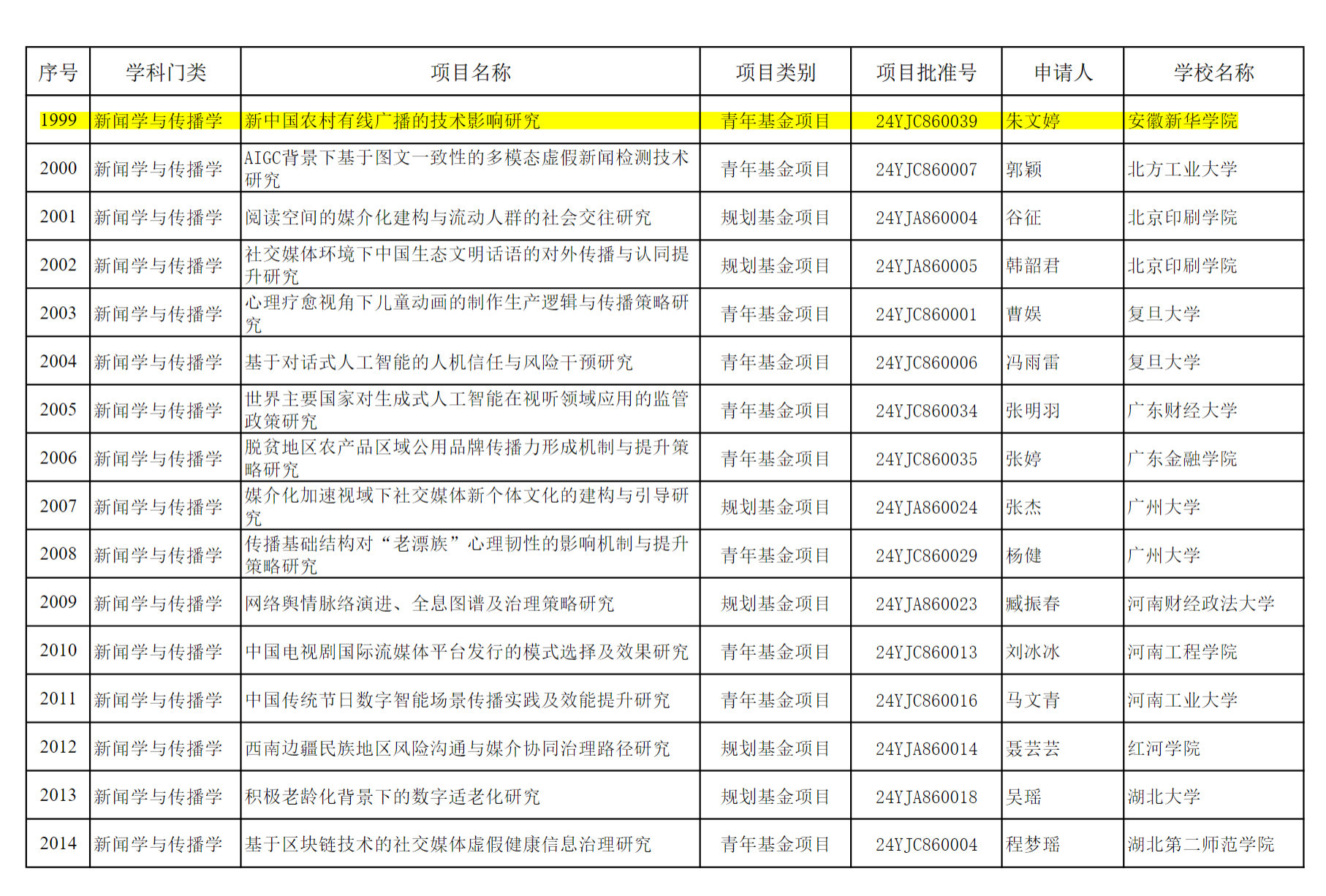 本網(wǎng)訊(通訊員:朱文婷,聶歡歡)近日,教育部社科司發(fā)布《關于2024年度教育部人文社會科學研究一般項目立項的通知》(教社科司函〔2024〕56號),我校文化與傳媒學院副教授朱文婷主持的《新中國農(nóng)村有線廣播的技術影響研究》(項目批號:24YJC860039)課題獲批立項青年基金項目。