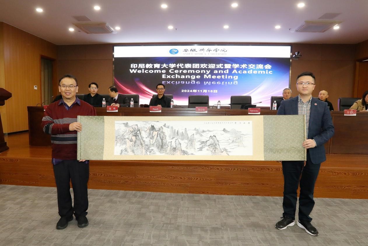 在歡迎式上,安徽新華學(xué)院副校長(zhǎng)賀行佳代表學(xué)校歡迎印尼教育大學(xué)代表團(tuán)的到來(lái),并詳細(xì)介紹了新華學(xué)院的發(fā)展歷程和辦學(xué)特色。他表示教育是連接多元文明的橋梁,是促進(jìn)心與心相通的紐帶,在“一帶一路”倡議下,今天的會(huì)面不僅是兩校交流的新起點(diǎn),也是助力我校教育工作在國(guó)際化發(fā)展道路上更進(jìn)一步。隨后,印尼教育大學(xué)教育學(xué)院院長(zhǎng)Rudi Susilana對(duì)我校的接待表示感謝,并介紹了印尼教育大學(xué)的辦學(xué)情況,他歡迎中方師資與管理團(tuán)隊(duì)去印尼教育大學(xué)參觀訪問(wèn),期待雙方可以繼續(xù)合作開展新的項(xiàng)目。文化與傳媒學(xué)院執(zhí)行院長(zhǎng)洪玉介紹了學(xué)院教育學(xué)科的優(yōu)勢(shì)及發(fā)展現(xiàn)狀,希望雙方能從學(xué)術(shù)會(huì)議、師生交流等領(lǐng)域加強(qiáng)合作,共同發(fā)展。會(huì)議期間雙方互贈(zèng)了禮品。