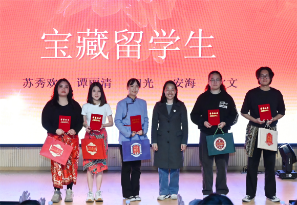 王麗為“寶藏留學(xué)生”頒發(fā)榮譽(yù)證書及獎(jiǎng)品,這些留學(xué)生在學(xué)術(shù)、文化、社交活動(dòng)等多個(gè)維度都有著突出貢獻(xiàn)和優(yōu)秀表現(xiàn),是校園里的閃耀之星。