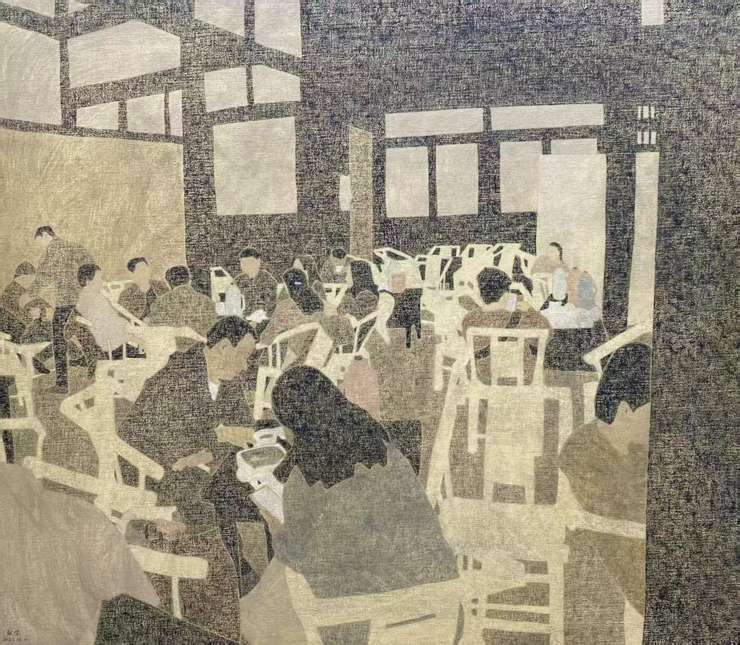 作品《小城故事系列五》以獨(dú)特的藝術(shù)視角,通過(guò)一條縱深的小巷將觀者視線引向新舊建筑交織的天際線,以斑駁墻面與錯(cuò)落盆栽的細(xì)膩刻畫,在懷舊氛圍與生活氣息間達(dá)成微妙平衡,生動(dòng)展現(xiàn)了城鄉(xiāng)變遷中的人居記憶。而《小城故事·茶館生活四》則以傳統(tǒng)茶館為題材,用精湛的油畫語(yǔ)言,生動(dòng)捕捉了市井生活中的寧?kù)o瞬間與人文溫情,畫面構(gòu)圖錯(cuò)落有致,筆觸細(xì)膩而富有韻味,是對(duì)寫意精神在當(dāng)代油畫創(chuàng)作中傳承與創(chuàng)新的成功探索。