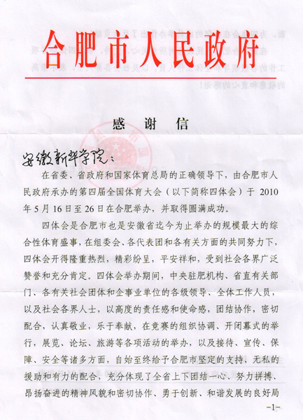 在省委、省政府和國家體育局的正確領導下,由合肥市人民政府承辦的第四屆全國體育大會于2010年5月16日至26日在合肥舉辦并取得圓滿成功。近日,合肥市人民政府發(fā)來感謝信,感謝我院對此次盛會的大力支持,感謝我院青年志愿者在盛會期間的協(xié)作、配合和奉獻。