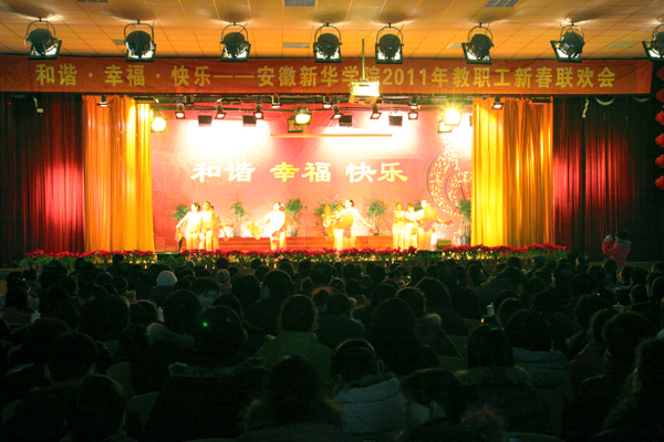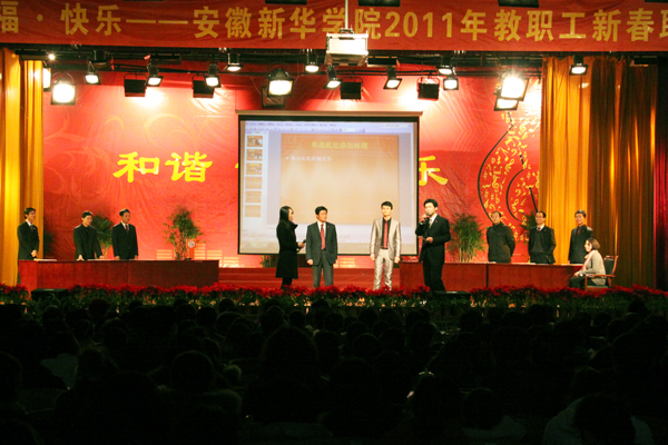 1月21日下午,一場(chǎng)以“幸福 和諧 快樂”為主題的安徽新華學(xué)院2011年教職工新春聯(lián)歡會(huì)在學(xué)院大禮堂隆重上演。集團(tuán)公司領(lǐng)導(dǎo)、學(xué)院領(lǐng)導(dǎo)、老教授及全體教職員工共同參加了本次聯(lián)歡會(huì),聯(lián)歡會(huì)在一片歡聲笑語中進(jìn)行。
