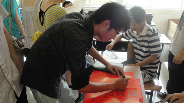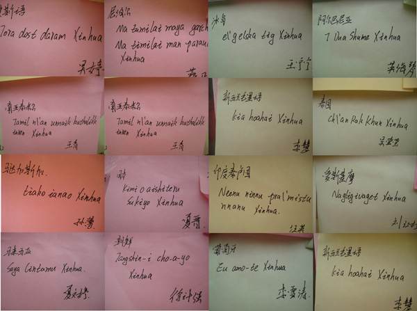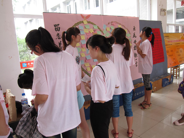 歲月像小河里的流水,帶著歡快的笑聲流去。在告別母校的時候,一定會想起在這里度過的幸福時光。同學(xué)們曾在這里學(xué)習(xí)做人、增長知識、鍛煉身體……校園里的一草一木、一沙一石,都能勾起畢業(yè)生對往事的美好回憶。自五月以來,信息工程學(xué)院開展畢業(yè)生感恩母?;顒?,全面征集畢業(yè)學(xué)子對母校的祝福語。各班級班委積極動員本班同學(xué),寄語母校,趕在收到同學(xué)們的祝福語后,信息工程學(xué)院助理團(tuán)的同學(xué)們將每一位同學(xué)的祝福認(rèn)真抄寫下來并署上每位同學(xué)的名字,組成“祝福母?!彼膫€字,在畢業(yè)生離校的時候展出來,營造了良好的氛圍。在本次活動中,同學(xué)們積極思考,發(fā)揚(yáng)創(chuàng)新精神,充分表達(dá)自己對學(xué)校的深厚感情。其中2008級計算機(jī)應(yīng)用技術(shù)1班69名同學(xué),將“新華我愛你”用69種語言翻譯出來,取得了非常好的效果。