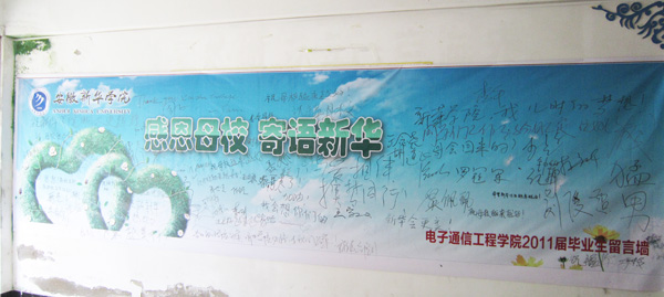 C樓一樓制作了以“感恩母校,寄語新華”為主題的畢業(yè)生留言墻,讓同學(xué)們盡情表達(dá)對母校、老師及同學(xué)的感恩和眷戀之情。在入口處兩邊及每個辦公教室門口都張貼學(xué)院的《2011屆畢業(yè)生文明離校倡議書》,告誡同學(xué)們“聚,是一團(tuán)火;散,是滿天星!在離別的日子里,大家要共同珍惜母校的點(diǎn)點(diǎn)滴滴,帶走雄心,留下愛心”。