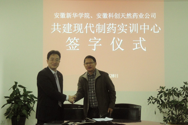 10月28日上午,安徽新華學(xué)院藥學(xué)院與安徽科創(chuàng)天然藥業(yè)公司共建“現(xiàn)代制藥實(shí)訓(xùn)中心”簽字儀式在安徽新華學(xué)院第二會(huì)議室隆重舉行。安徽新華學(xué)院教學(xué)副院長(zhǎng)馬鳳余教授、安徽科創(chuàng)天然藥業(yè)公司董事長(zhǎng)余世春教授、藥學(xué)院院長(zhǎng)張國(guó)升教授出席了簽字儀式,藥學(xué)院教師、學(xué)生代表共二十余人共同參加了簽字儀式。