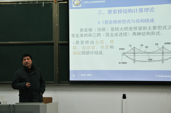 王建國教授現(xiàn)任合肥工業(yè)大學(xué)土木與水利工程學(xué)院教授、博士生導(dǎo)師,在大跨度橋梁計(jì)算理論和方法、智能材料與結(jié)構(gòu)、工程中數(shù)值方法等方面有很深的學(xué)術(shù)造詣。王建國教授從橋梁的起源講到當(dāng)今世界上科技含量高、技術(shù)難度大的超大跨徑懸索橋、斜拉橋及其組合形式的橋梁,報(bào)告中列舉了世界各國著名的橋梁,這些安全適用又造型優(yōu)美的橋梁無不成為當(dāng)?shù)氐牡貥?biāo)性建筑、成為城市一道優(yōu)美的風(fēng)景線。在廣大師生被王教授的精彩講解深深吸引之時(shí),他又提出了這些優(yōu)美橋梁的結(jié)構(gòu)計(jì)算理論,帶領(lǐng)師生學(xué)習(xí)了大跨徑橋型——懸索橋(吊橋)的四次發(fā)展高峰期和懸索橋結(jié)構(gòu)計(jì)算理論的發(fā)展,講解了從線彈性理論到撓度理論再到目前的有限位移理論。講座最后,王建國教授又為師生們分析了世界橋梁的未來發(fā)展趨勢(shì)。
