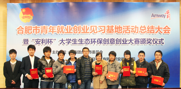會(huì)上,合肥團(tuán)市委副調(diào)研員賈賢勇宣布了“安利杯”大學(xué)生生態(tài)環(huán)保創(chuàng)業(yè)大賽的獲獎(jiǎng)名單,合肥工業(yè)大學(xué)王晨晨 “針對生態(tài)合肥建設(shè)中的成功案例進(jìn)行的系統(tǒng)科學(xué)調(diào)研”,安徽新華學(xué)院何業(yè)祥“校園再生資源回收”等榮獲二等獎(jiǎng),安徽外國語學(xué)院孫蘊(yùn)“環(huán)保主題網(wǎng)站”、萬博科技職業(yè)學(xué)院徐振偉“太陽能熱水器使用情況調(diào)查”、安徽新華學(xué)院的張亮“太陽能被子”、王敏“環(huán)保友善型現(xiàn)代農(nóng)場創(chuàng)業(yè)計(jì)劃”、趙寶森等同學(xué)的“校園環(huán)保能源沼氣池”獲得了三等獎(jiǎng)。到會(huì)領(lǐng)導(dǎo)為獲獎(jiǎng)同學(xué)頒發(fā)證書、獎(jiǎng)金并合影留念。