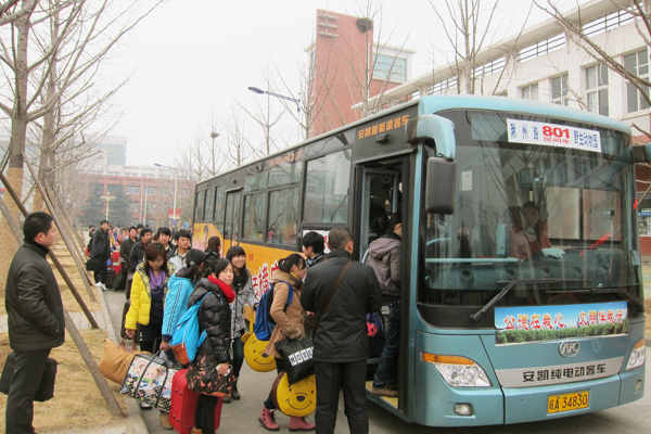 我校學(xué)生人數(shù)規(guī)模較大,放假時間又較為集中,為方便學(xué)生放假返鄉(xiāng)時能安全、快捷的前往汽車站和火車站。經(jīng)學(xué)生處聯(lián)系,合肥公交集團(tuán)九車隊安排了多輛801線路公交車進(jìn)校園接送學(xué)生。該公交車只在汽車站和火車站停靠,原本要花費1個小時的行車時間,“學(xué)生專車”只需30分鐘便可到達(dá)車站。公交車進(jìn)校園避免了學(xué)生上下車的擁堵,降低了安全隱患,節(jié)約了時間,極大地便利了學(xué)生返鄉(xiāng)出行。