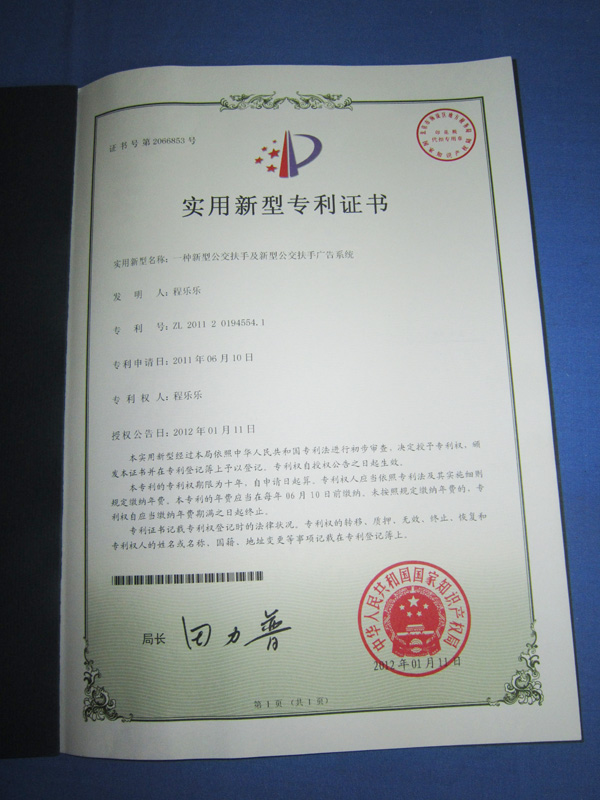程樂樂的發(fā)明——“一種新型公交扶手及新型公交扶手廣告系統(tǒng)”,是運用電子技術(shù)把傳統(tǒng)靜態(tài)紙質(zhì)顯示的公交扶手創(chuàng)新成動態(tài)信息式并附有無線控制和游戲等新型環(huán)保的公交扶手。