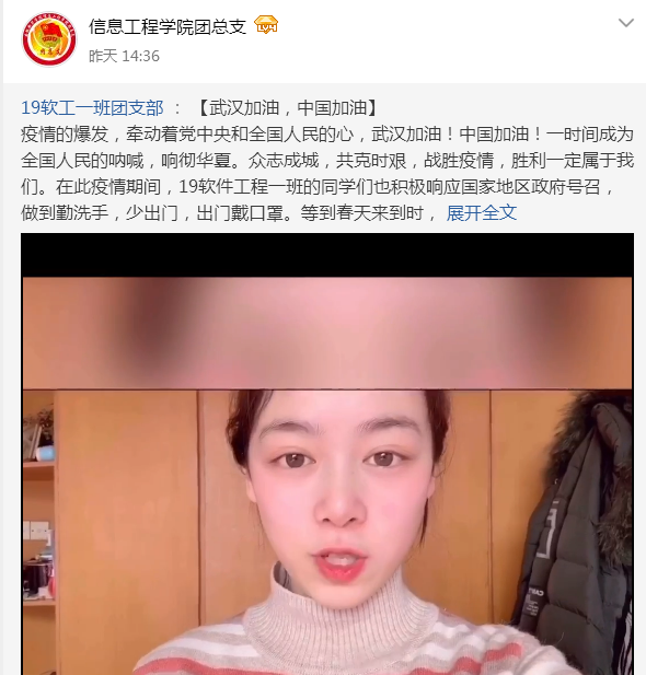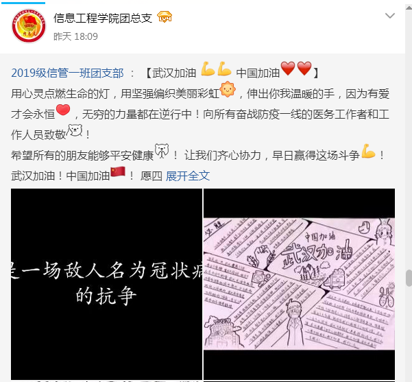 在這一場無煙的戰(zhàn)“疫”中,團(tuán)員青年生力軍的作用得以發(fā)揮,信息工程學(xué)院團(tuán)總支的宣傳、文藝、心理咨詢等志愿者也結(jié)合自身特長開展了防疫知識宣講、心理咨詢服務(wù)、文藝宣傳等一系列線上志愿服務(wù)活動。同時還制作抗“疫”微視頻,用影音傳遞愛;寫下希望和祝福,用書畫傳遞愛;以實(shí)際行動為抗擊疫情貢獻(xiàn)力量,用責(zé)任感和行動力詮釋青春正能量。