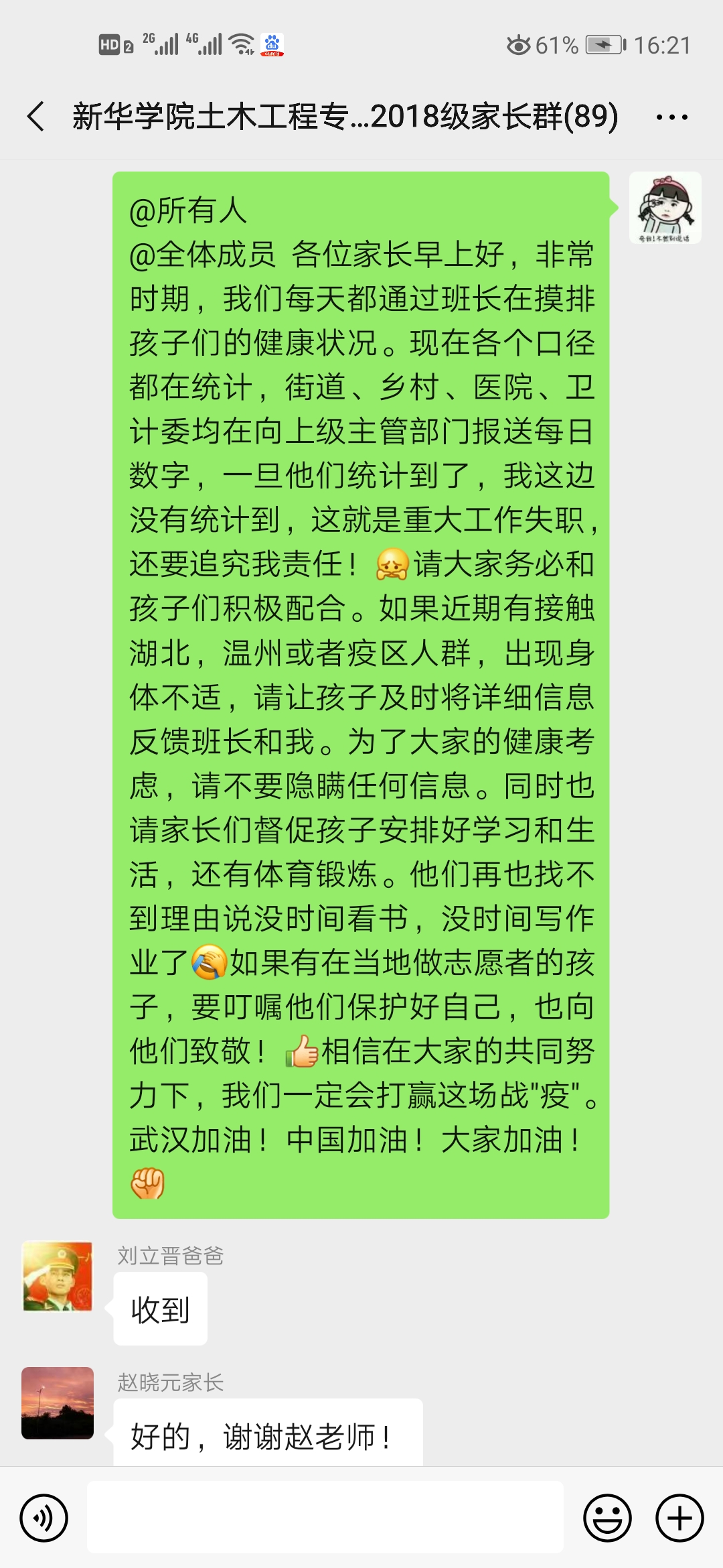 防疫前期,各輔導(dǎo)員利用專業(yè)班級(jí)QQ群、家長(zhǎng)微信群和電話等方式進(jìn)行排查,準(zhǔn)確摸排每一位學(xué)生的身體狀況、出行情況以及思想動(dòng)態(tài),是否與武漢等疫區(qū)人員有過(guò)接觸,接觸時(shí)間地點(diǎn),是否有發(fā)燒,咳嗽,呼吸困難等癥狀,包括家人狀況,并安排各班班長(zhǎng)每天匯報(bào)班級(jí)學(xué)生情況,做到雙管齊下。同時(shí),及時(shí)通報(bào)學(xué)校的通知和部署、開展疫情防控宣傳、統(tǒng)計(jì)各項(xiàng)基礎(chǔ)數(shù)據(jù)。