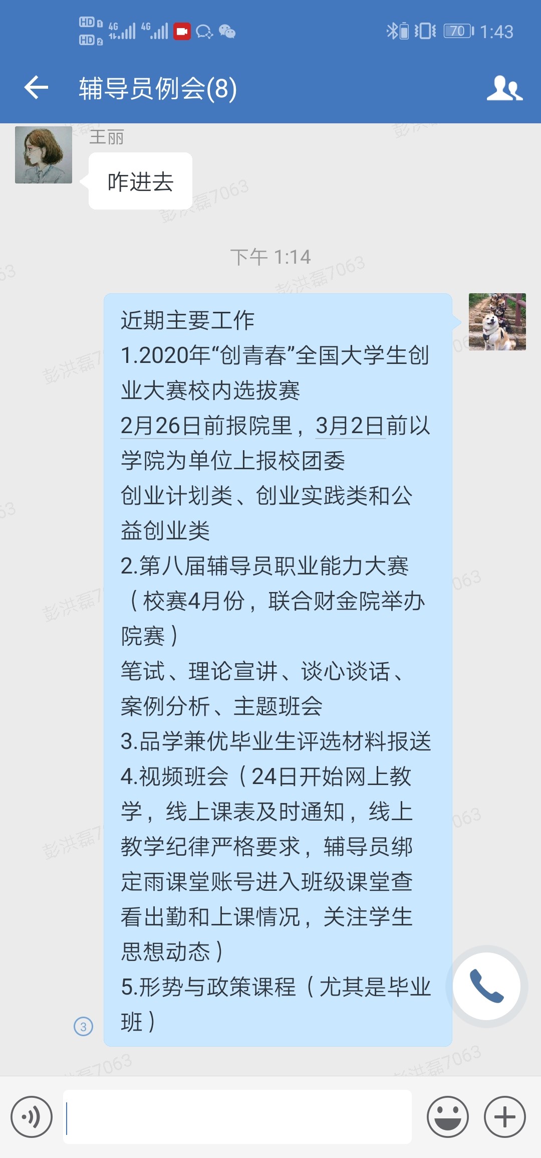 2月21日,學(xué)院召開學(xué)生工作視頻例會(huì),布置了2020年“創(chuàng)青春”全國(guó)大學(xué)生創(chuàng)新創(chuàng)業(yè)大賽校內(nèi)選拔賽、第八屆輔導(dǎo)員職業(yè)能力大賽等近期重點(diǎn)工作。要求輔導(dǎo)員召開視頻班會(huì),將線上教學(xué)課表通知到每一名學(xué)生,對(duì)線上學(xué)習(xí)紀(jì)律進(jìn)行嚴(yán)格要求。