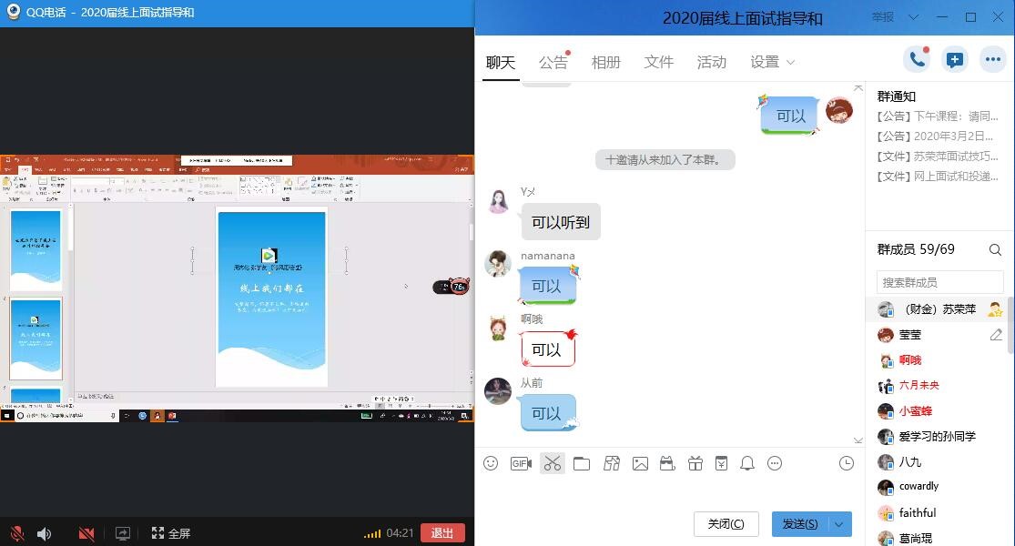 本網(wǎng)訊(通訊員:魏銀銀)鑒于目前新型冠狀病毒感染的肺炎疫情新形勢(shì),根據(jù)財(cái)會(huì)與金融學(xué)院“金財(cái)未來”2020屆畢業(yè)生就業(yè)工作方案,3月2日,財(cái)會(huì)與金融學(xué)院開展線上“云求職背景下線上面試指導(dǎo)會(huì)”,指導(dǎo)會(huì)由蘇榮萍老師主講,朱敏老師、余靜老師參與指導(dǎo),部分2020屆畢業(yè)生參與。會(huì)議由行政秘書主持。