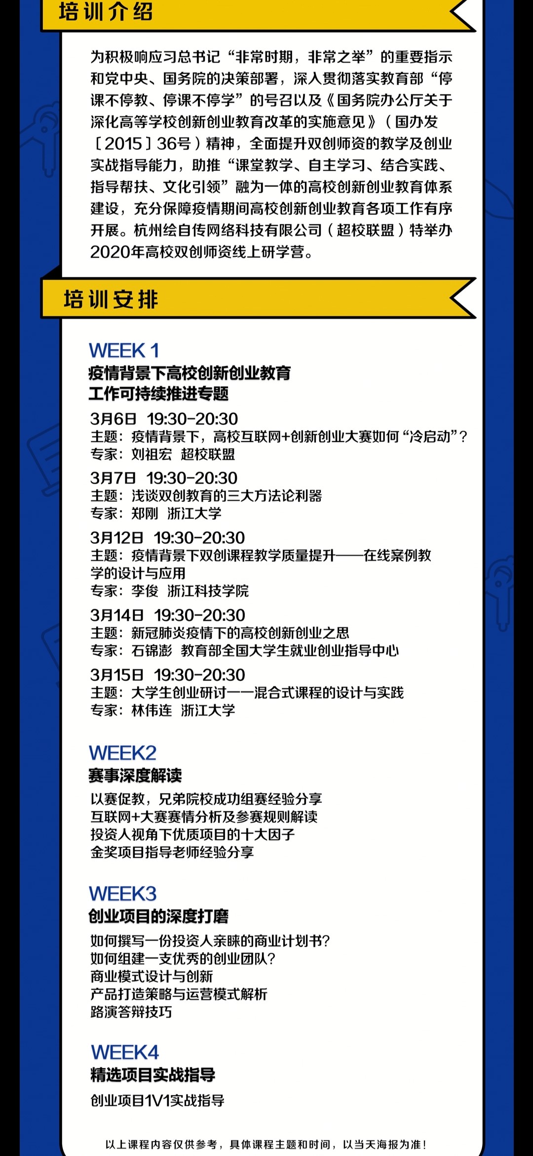 本次研學(xué)營(yíng)活動(dòng)由超校聯(lián)盟舉辦,從3月6日至4月6月歷時(shí)一個(gè)月,涵蓋《疫情背景下,高?;ヂ?lián)網(wǎng)+創(chuàng)新創(chuàng)業(yè)大賽如何“冷”啟動(dòng)》、《淺談雙創(chuàng)教育的三大方法論利器》、《新冠肺炎疫情下的高校創(chuàng)新創(chuàng)業(yè)之思》等15個(gè)課程。在首次課程中,上海繪自傳網(wǎng)絡(luò)科技有限公司董事、超校聯(lián)盟聯(lián)合創(chuàng)始人、“互聯(lián)網(wǎng)+”創(chuàng)新創(chuàng)業(yè)大賽國(guó)賽評(píng)委劉祖宏從大賽概況、備賽要點(diǎn)、賽事趨勢(shì)等方面給學(xué)員進(jìn)行了分享,同時(shí)他強(qiáng)調(diào)“互聯(lián)網(wǎng)+”創(chuàng)新創(chuàng)業(yè)大賽的本質(zhì)還是以賽促教、以賽促創(chuàng),回歸人才培養(yǎng)的本源。