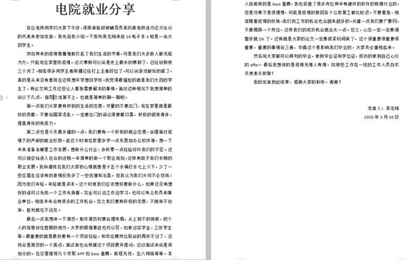 2016級(jí)電子專業(yè)吳飛翔同學(xué)則是通過文字整理的方式,將自己的求職經(jīng)歷形成文字稿和同學(xué)們進(jìn)行交流,他表示超長寒假讓大家都十分想念學(xué)校,但在不能回校的時(shí)候,大家還是要面對(duì)現(xiàn)實(shí)生活,在做好防護(hù)加強(qiáng)身體鍛煉的同時(shí),要積極的開展畢業(yè)論文寫作、網(wǎng)上求職等,不能止步不前,要相信隨著疫情形勢(shì)的好轉(zhuǎn),一切都會(huì)好起來。