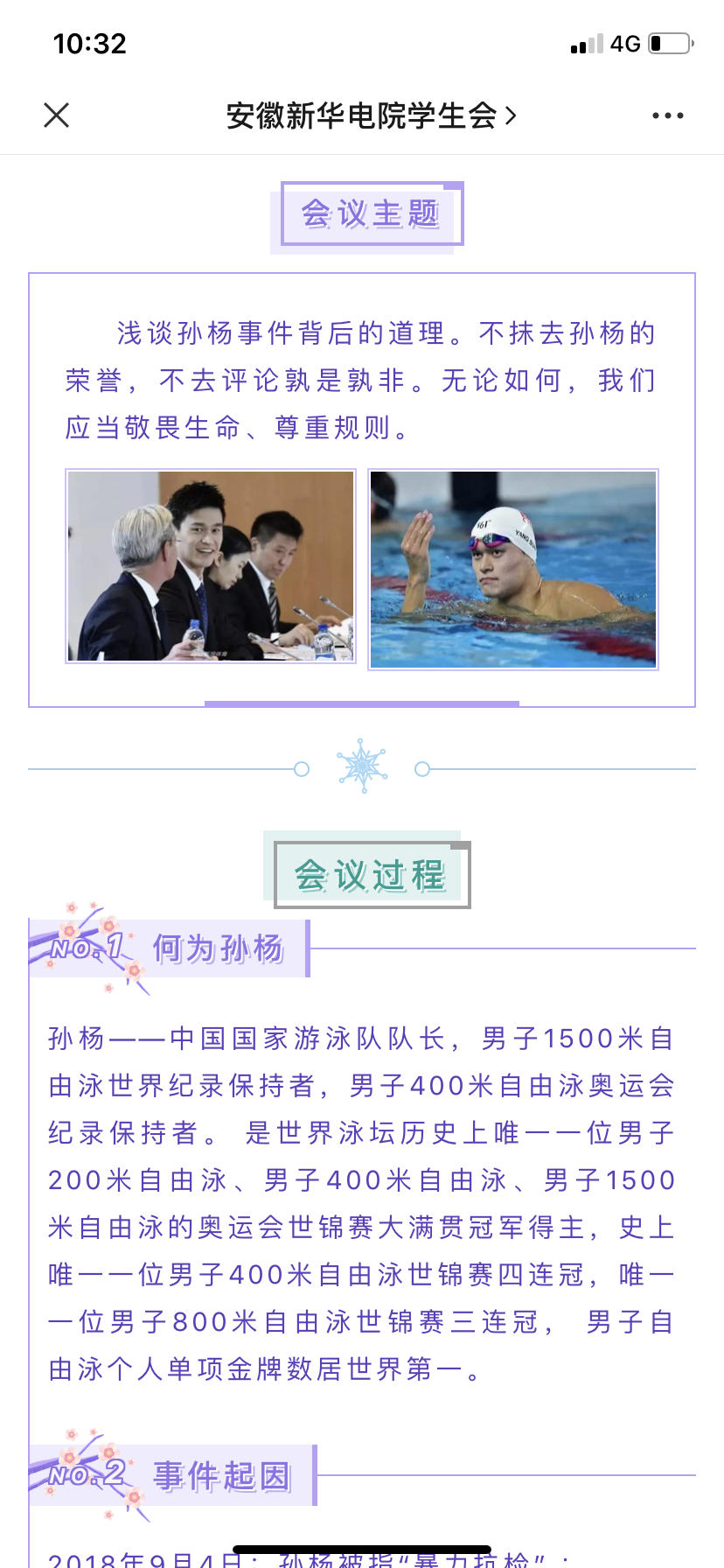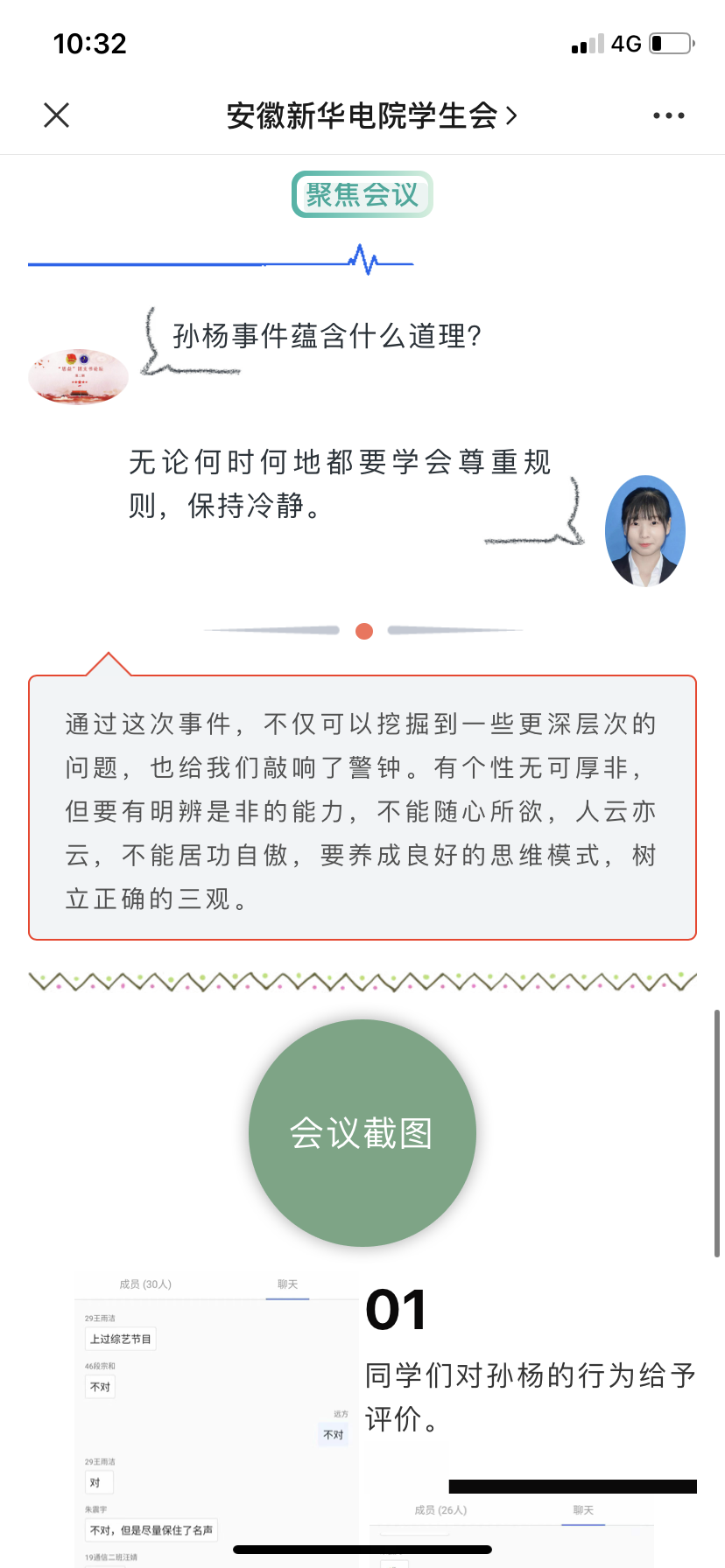 會議開始,主講人李萍首先簡述孫楊事件始末,從2018年9月4日至2020年2月28日,持續(xù)了長達(dá)一年多的反復(fù)訴訟,最后以孫楊被禁賽8年而告終。然后主持人提出圍繞事件的兩個關(guān)鍵詞:“規(guī)則”與“冷靜”,指出該事件會一直發(fā)酵的原因,不只因?yàn)槠渖頌楣娙宋?,更來源于背后所蘊(yùn)含的道理——社會是一個復(fù)雜且充滿規(guī)則的系統(tǒng)。大學(xué)中的“規(guī)則”即校規(guī)校紀(jì),學(xué)生們應(yīng)敬畏規(guī)則、遵守行為準(zhǔn)則,保持良好的精神風(fēng)貌。離開學(xué)校后就要接受社會的檢驗(yàn),不能輕視規(guī)則,心存僥幸,認(rèn)識到?jīng)]有護(hù)身符可以終身護(hù)航,只有尊重規(guī)則,才能實(shí)現(xiàn)對自己的守護(hù),對生命的敬畏。同時要學(xué)會管理情緒、保持冷靜面對生活中的各類挫折,避免用憤怒的方式解決問題。會議中大家思考:倘若當(dāng)初孫楊沒有拒檢,結(jié)局是否就不一樣了……在自由表達(dá)環(huán)節(jié),一位同學(xué)說到:“沖動是魔鬼,任何時候,都應(yīng)平淡看事,冷靜處事,這樣才不會被別人誤導(dǎo),做出錯誤的決定”。會上,同學(xué)們踴躍發(fā)言,積極表達(dá)自己的心得體會,并進(jìn)行交流分享。