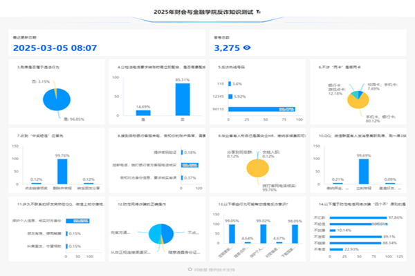 通過設(shè)計反詐知識經(jīng)典問答題目,與身邊經(jīng)典案例相結(jié)合,分值梯度式設(shè)置,探索打造“增強防詐意識+查缺補漏”的進(jìn)階式線上反詐知識測試卷。精準(zhǔn)識別學(xué)生反詐薄弱環(huán)節(jié),助力學(xué)生答中學(xué)、學(xué)中深化,不斷增強學(xué)生識詐、防詐能力。對匯總的答卷進(jìn)行深度剖析,結(jié)合經(jīng)典案例,劃分易受騙群體,為學(xué)生防詐指導(dǎo)精準(zhǔn)賦能。通過“測試—分析—干預(yù)—反饋”閉環(huán),推動校園反詐教育從短期宣傳向能力養(yǎng)成轉(zhuǎn)變,實現(xiàn)防詐屏障的動態(tài)加固。