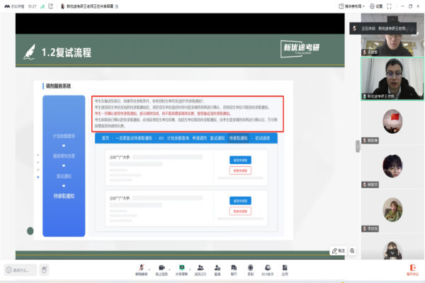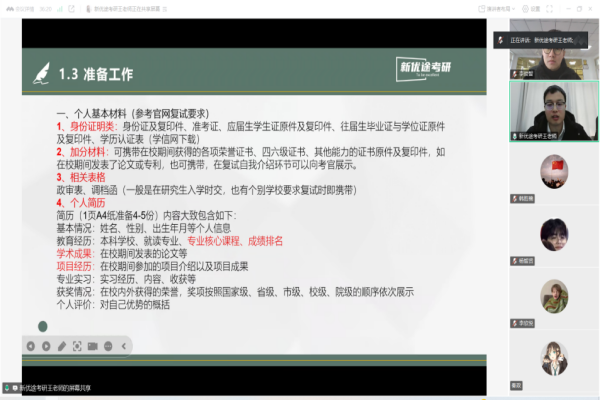 會(huì)上,王志勇老師以"復(fù)試突圍與調(diào)劑策略"為主題展開系統(tǒng)指導(dǎo)。他結(jié)合最新考研政策動(dòng)態(tài),從材料準(zhǔn)備、專業(yè)筆試、綜合面試、英語(yǔ)考核四個(gè)模塊梳理復(fù)試全流程,重點(diǎn)講解了學(xué)術(shù)簡(jiǎn)歷撰寫、導(dǎo)師研究方向匹配、論文研讀等備考細(xì)節(jié)。