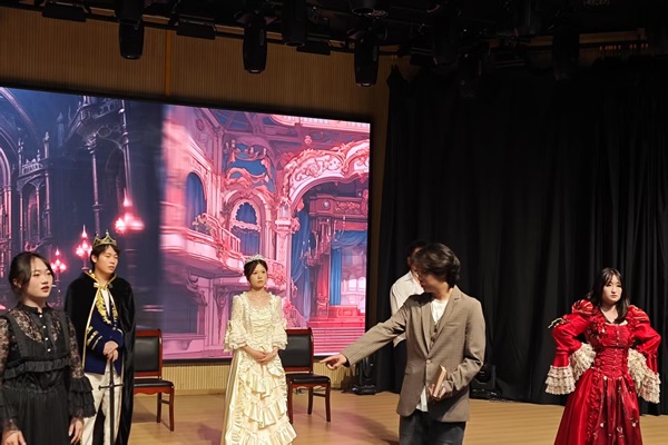 閉幕式以一段精心制作的視頻拉開帷幕,回顧了本屆讀書節(jié)開幕以來的各項活動,記錄了同學們參與的過程及感觸;榮譽時刻,讀書節(jié)期間各項活動的優(yōu)勝者們上臺接受組委會為其頒發(fā)的榮譽證書,同時各項活動的冠軍得主上臺分享展示。書簽制作大賽的獲獎?wù)邽榇蠹曳窒砹俗约旱膭?chuàng)作構(gòu)思,閱讀分享大賽的獲獎?wù)咭元毜揭娊庠忈屃藭牧α?,而跨文本小說創(chuàng)作大賽的獲獎?wù)邆儎t通過話劇表演的形式,為大家展示了一場奇異的跨時空對話。
