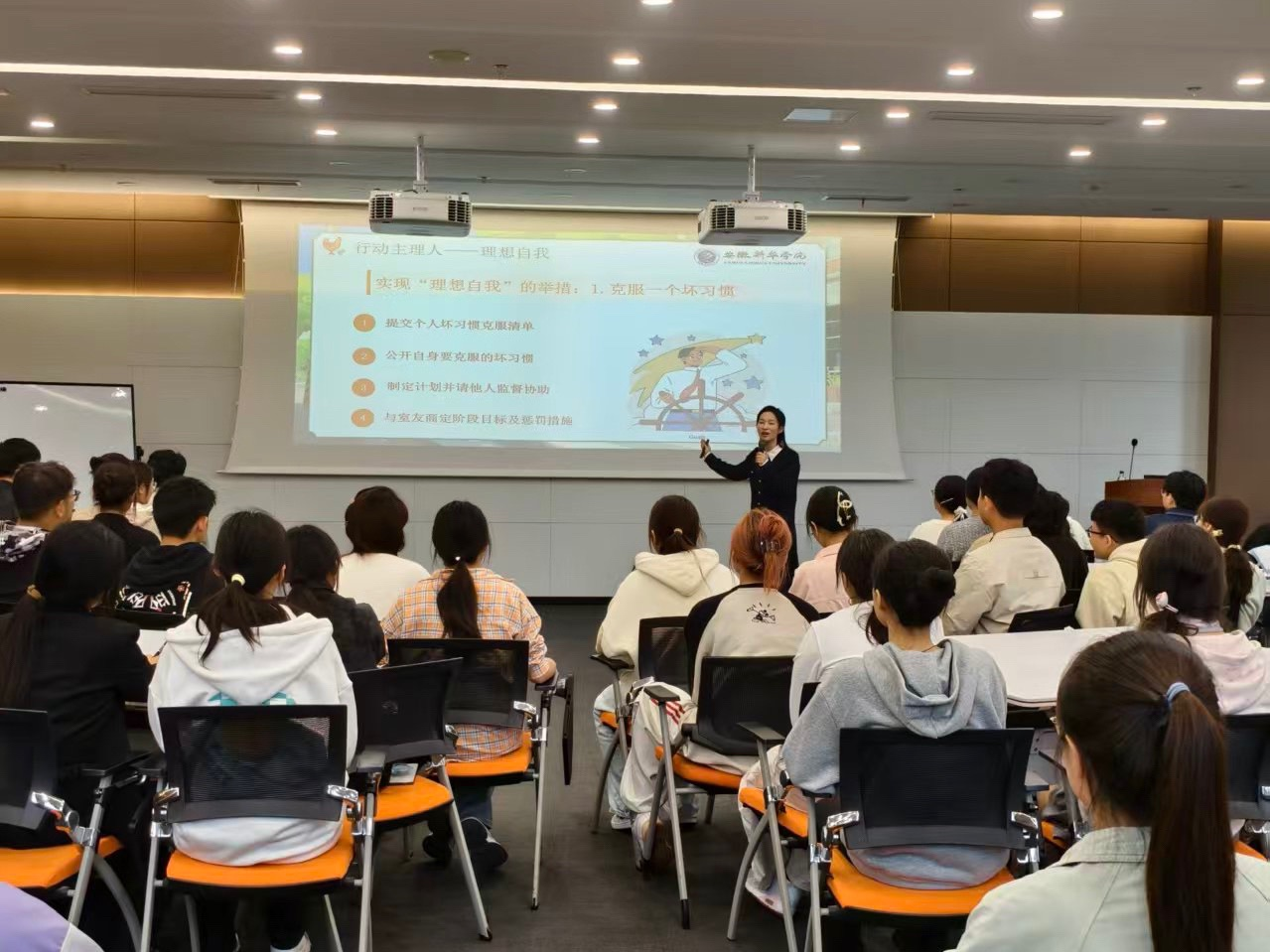 外國語學院樊遠鳳老師則以“核心價值觀構(gòu)建”為主題,通過精心設(shè)計的互動環(huán)節(jié),引導學生深入探討理想班集體的內(nèi)涵。在分組討論環(huán)節(jié),同學們踴躍發(fā)言,提出了“勤學”“互助”“服務(wù)”“奉獻”等一系列具有代表性的價值詞匯。經(jīng)過民主表決,最終確立了班級共同遵循的核心價值觀。在此基礎(chǔ)上,樊老師引導學生圍繞寢室、教室、校園、網(wǎng)絡(luò)四個生活場景,共同制定了切實可行的“四大公約”,不僅進一步明確了學生行為底線,還建立了相應(yīng)的監(jiān)督機制,有效強化了學生的規(guī)則意識和集體責任感。