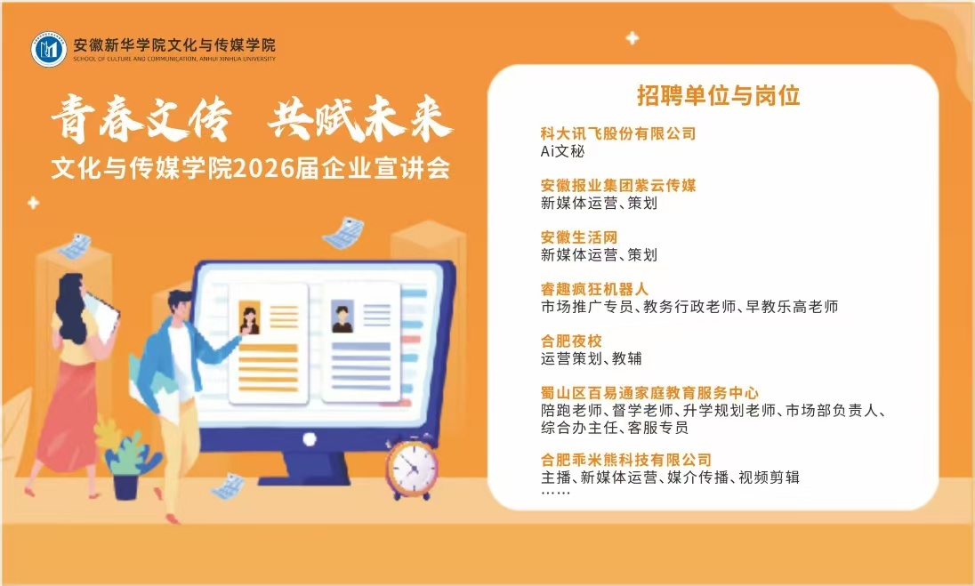 學院接續(xù)舉辦“青春文傳 共賦未來”2026屆畢業(yè)生企業(yè)專場宣講會,作為“崗位直通-企業(yè)對接日”活動的深化拓展,此次宣講會精準對接就業(yè)市場需求,邀請科大訊飛股份有限公司、安徽報業(yè)集團紫云傳媒、安徽生活網(wǎng)等多家優(yōu)質(zhì)企業(yè)進校招聘。宣講覆蓋AI文秘、新媒體運營、教育服務、直播傳媒等多個專業(yè)領(lǐng)域,各企業(yè)負責人詳細介紹了業(yè)務范圍、人才需求及職業(yè)發(fā)展路徑:科大訊飛設(shè)置AI文秘崗;安徽報業(yè)集團紫云傳媒、安徽生活網(wǎng)開放新媒體運營與策劃崗;睿趣瘋狂機器人、蜀山區(qū)百易通家庭教育服務中心、合肥乖米熊科技有限公司、合肥夜校等企業(yè)也分別提供市場推廣、教育教學、主播、視頻剪輯、運營策劃等多元化崗位?,F(xiàn)場氣氛熱烈,2026屆畢業(yè)生積極與企業(yè)代表互動,圍繞崗位要求、職業(yè)發(fā)展等問題深入溝通。企業(yè)代表表示,通過“崗位直通-企業(yè)對接日”系列活動,與學院建立了緊密合作關(guān)系,對學子的專業(yè)素養(yǎng)和綜合能力印象深刻。