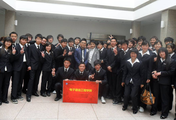 節(jié)目結(jié)束后,節(jié)目主持人阿進和小潘潘與電院師生進行合影留念。(電子通信工程學院)