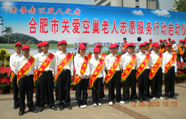 5月12日上午, 合肥市關(guān)愛(ài)空巢老人志愿服務(wù)行動(dòng)啟動(dòng)儀式在人民廣場(chǎng)舉行。省文明辦主任賀懋燮,市委常委、宣傳部長(zhǎng)林存安,市人大常委會(huì)副主任杜昌壽,市政協(xié)副主席盛志剛出席了啟動(dòng)儀式。本次活動(dòng)由市文明辦、市民政局、團(tuán)市委共同主辦,由廬陽(yáng)區(qū)委、區(qū)政府承辦。我院共有20名志愿者參加了此次活動(dòng)。