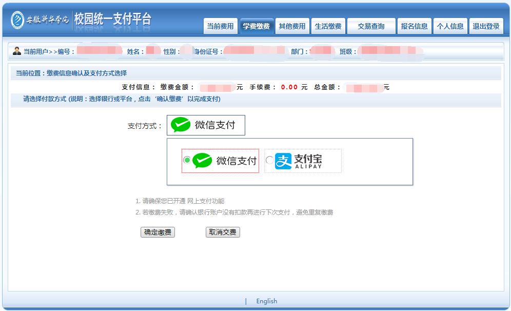 (5) 選擇付費(fèi)方式后,點(diǎn)擊“確定繳費(fèi)”(目前支持微信支付和支付寶兩種支付方式)(圖7)