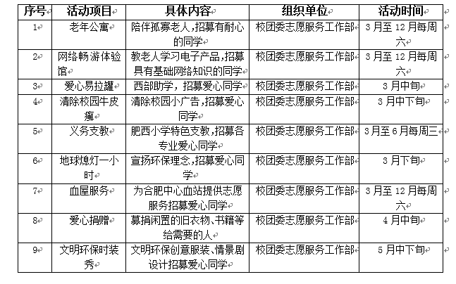 (三)鼓勵并動員學(xué)生參與志愿公益系列活動,通過傳遞正能量培養(yǎng)學(xué)生高尚的情操和文明道德修養(yǎng)。校團委現(xiàn)面向全校招募志愿者,具體活動如下: