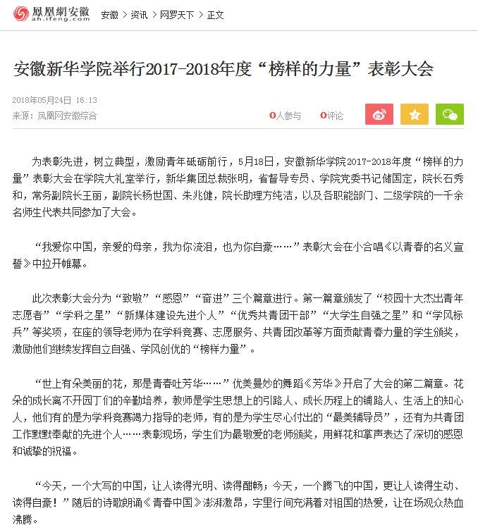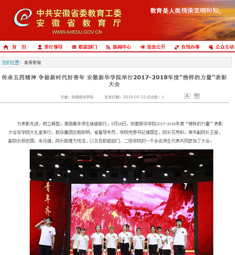 安徽教育網(wǎng)、鳳凰網(wǎng)安徽:傳承五四精神 爭做新時代好青年 安徽新華學(xué)院舉行2017-2018年度“榜樣的力量”表彰大會