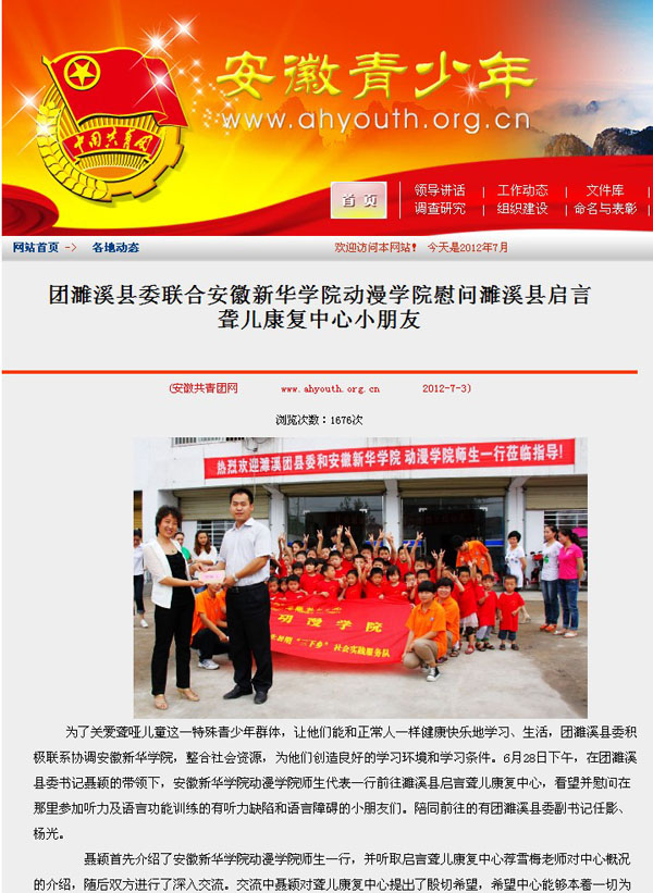我校動(dòng)漫學(xué)院暑期三下鄉(xiāng)社會(huì)實(shí)踐隊(duì)聯(lián)合淮北市濉溪團(tuán)縣委慰問(wèn)濉溪縣啟言聾兒學(xué)校的孩子們活動(dòng),受到安徽省團(tuán)省委的高度關(guān)注,團(tuán)省委領(lǐng)導(dǎo)通過(guò)濉溪縣團(tuán)縣委向我校動(dòng)漫學(xué)院師生發(fā)來(lái)了慰問(wèn)和感謝,活動(dòng)的新聞稿件也被安徽省青少年門(mén)戶網(wǎng)站于7月3日第一時(shí)間轉(zhuǎn)載。