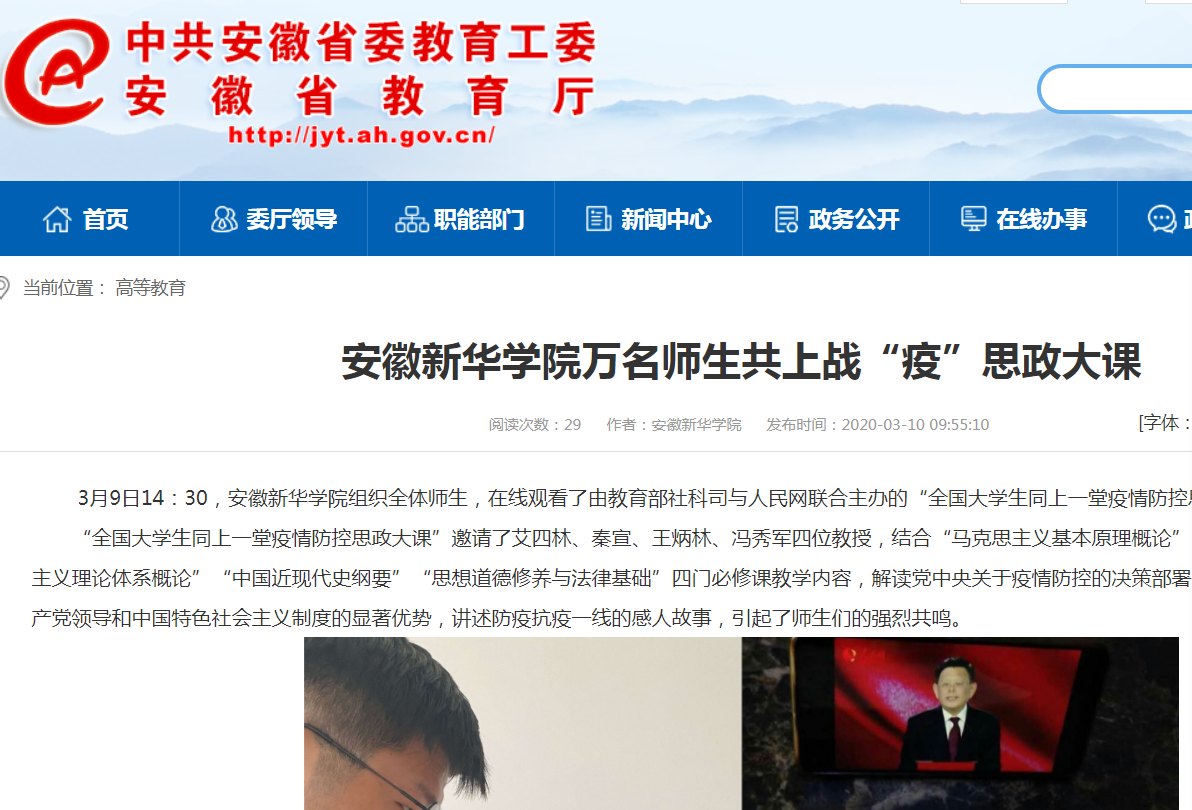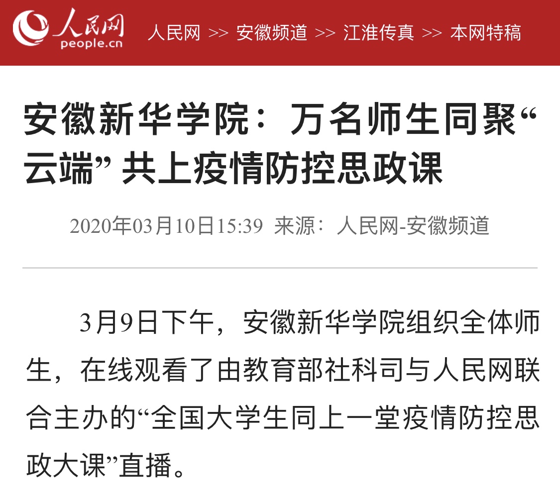 3月9號,由教育部社科司與人民網(wǎng)聯(lián)合主辦的“全國大學(xué)生同上一堂疫情防控思政大課”直播課開播。多家主流媒體對安徽新華學(xué)院:萬名師生共上戰(zhàn)“疫”思政直播大課的學(xué)習(xí)情況進(jìn)行全面報(bào)道