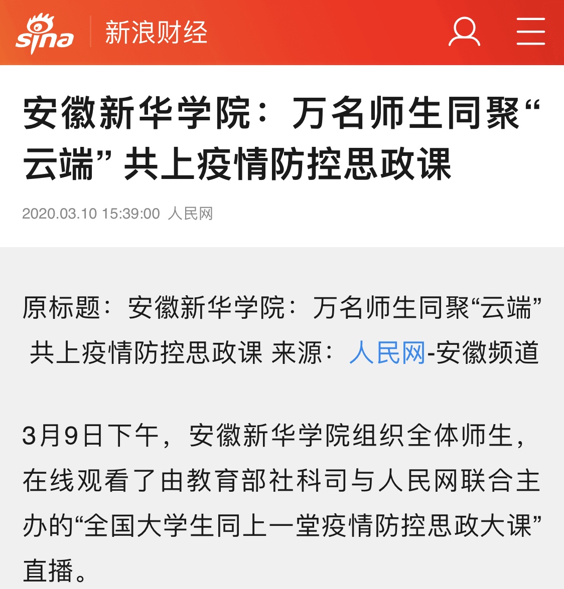 多家主流媒體對安徽新華學(xué)院:萬名師生共上戰(zhàn)“疫”思政直播大課的學(xué)習(xí)情況進(jìn)行全面報(bào)道
