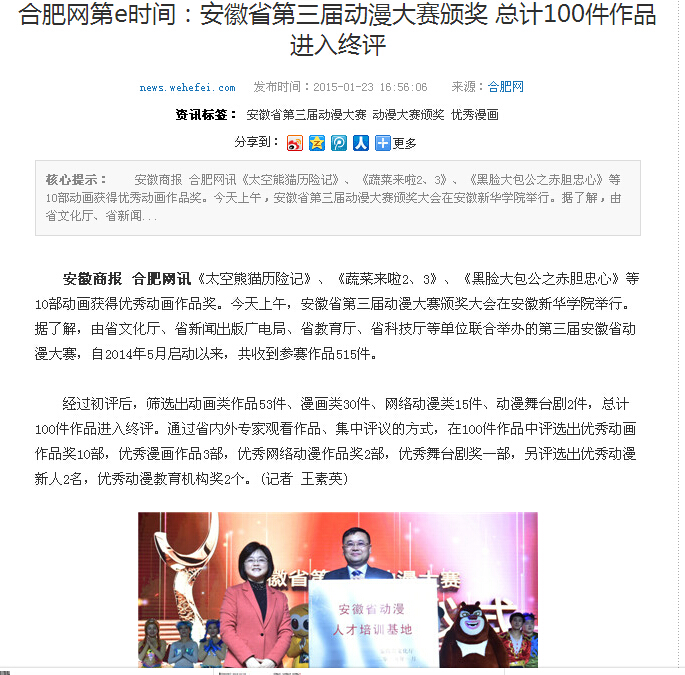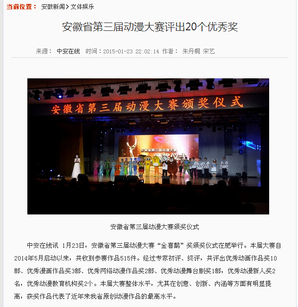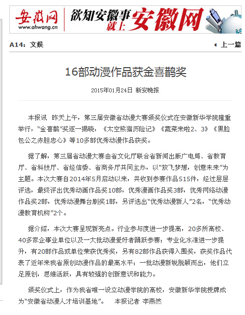 安徽日?qǐng)?bào)、新安晚報(bào)、安徽商報(bào)、中安在線報(bào)道我校承辦安徽省第三屆動(dòng)漫大賽“金喜鵲”頒獎(jiǎng)儀式