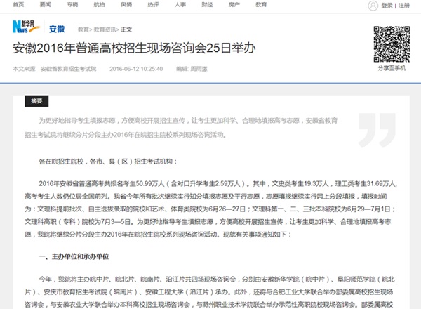 安徽日報、鳳凰資訊、新華網(wǎng)安徽:我省將舉辦四場高招現(xiàn)場咨詢會