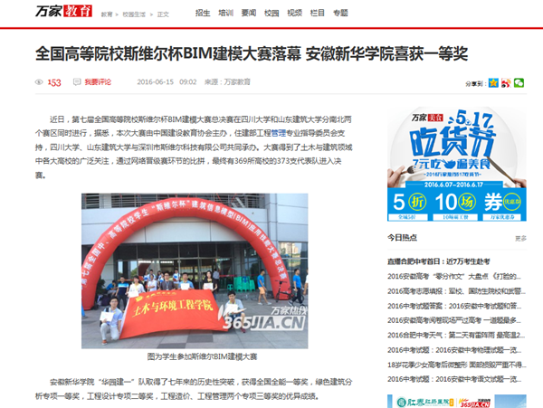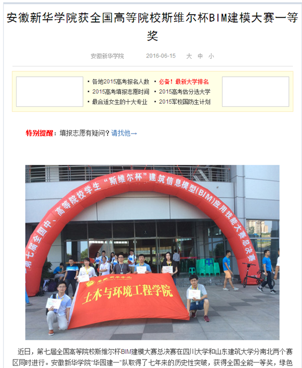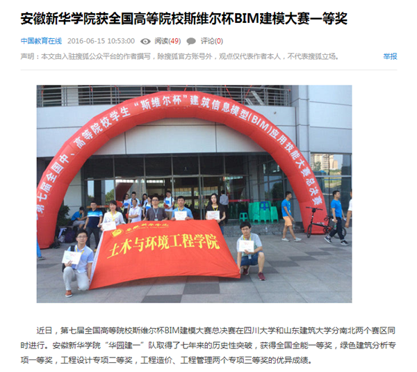 中國教育在線、搜狐網(wǎng)、今日頭條、萬家熱線:安徽新華學(xué)院獲全國高等院校斯維爾杯BIM建模大賽一等獎