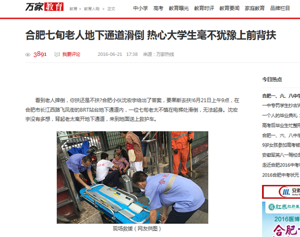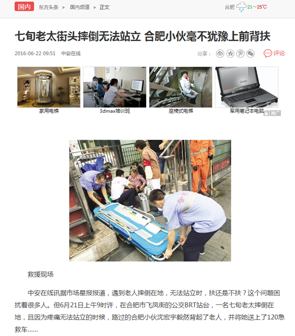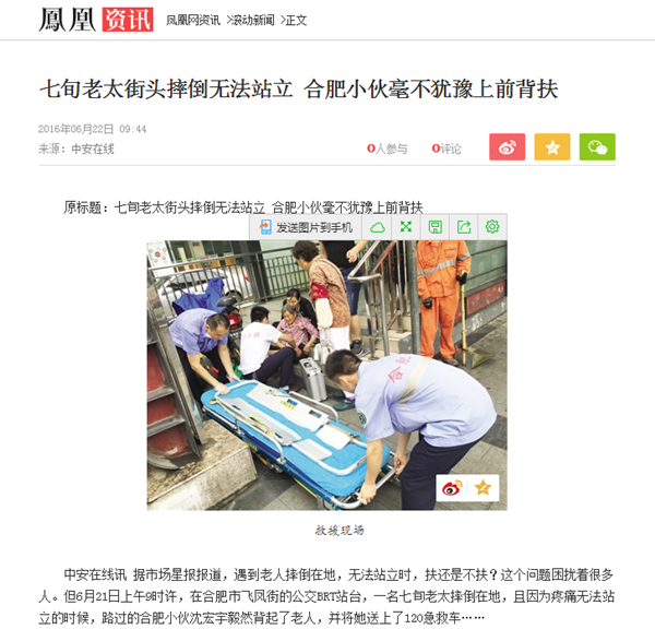 新安晚報(bào)、市場(chǎng)星報(bào)、今日頭條、東方頭條、鳳凰資訊、新浪安徽、萬家熱線等20余家媒體:七旬老太街頭摔倒無法站立 合肥小伙毫不猶豫上前背扶