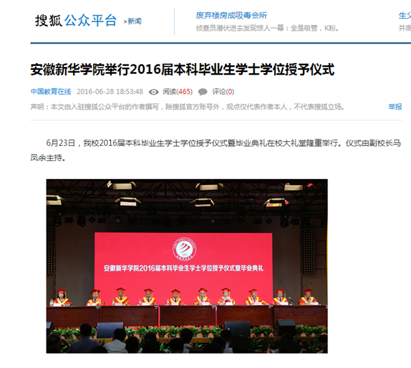 搜狐網、萬家熱線:安徽新華學院舉行2016屆本科畢業(yè)生學士學位授予儀式