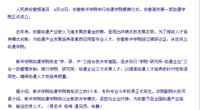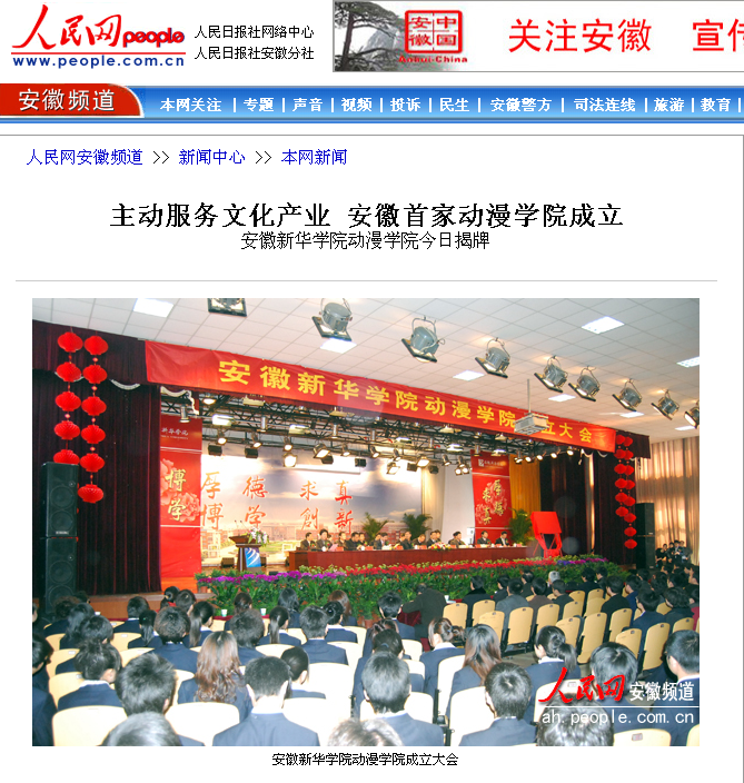 《人民網(wǎng)》:主動(dòng)服務(wù)文化產(chǎn)業(yè) 安徽首家動(dòng)漫學(xué)院成立——安徽新華學(xué)院動(dòng)漫學(xué)院今日揭牌