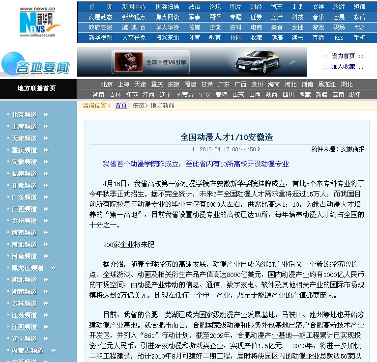 2010年4月17日,新華網(wǎng)/各地要聞/安徽/地方新聞對我院動漫學院成立進行了相關報道。相關鏈接:http://www.xinhuanet.com/chinanews/2010-04/17/content_19545084.htm