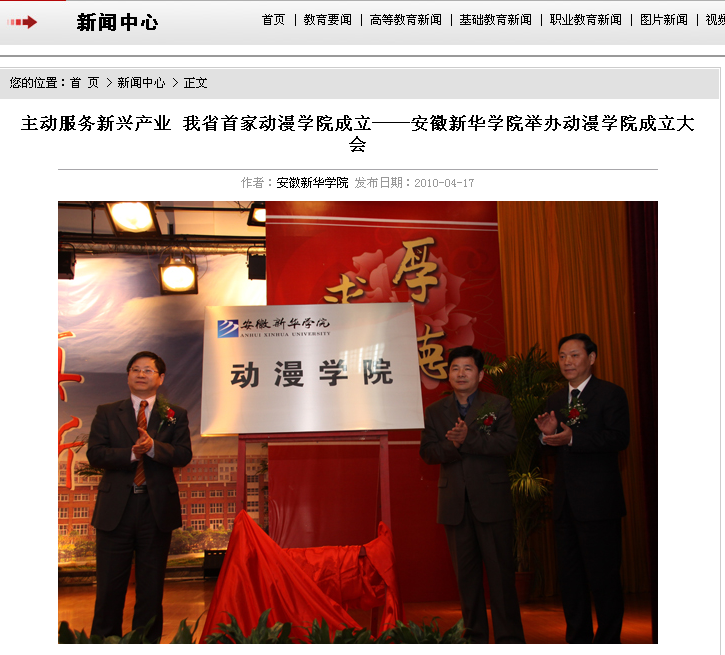 《安徽教育網(wǎng)》:主動服務(wù)新興產(chǎn)業(yè) 我省首家動漫學院成立——安徽新華學院舉辦動漫學院成立大會