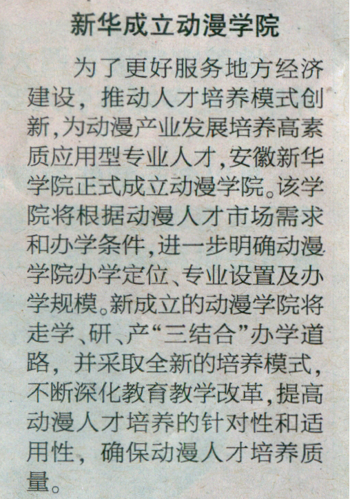2010年4月23日,新安晚報(bào)/教育/資訊/C04版對(duì)我院動(dòng)漫學(xué)院成立一事進(jìn)行了相關(guān)報(bào)道。