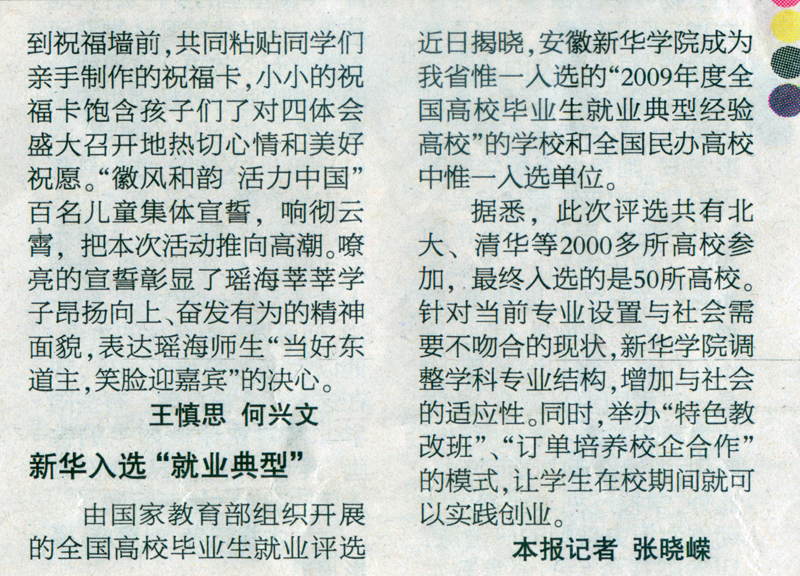2010年5月12日,新安晚報(bào)C05教育資訊版對(duì)我院入選全國(guó)就業(yè)典型經(jīng)驗(yàn)高校一事進(jìn)行了相關(guān)報(bào)道。
