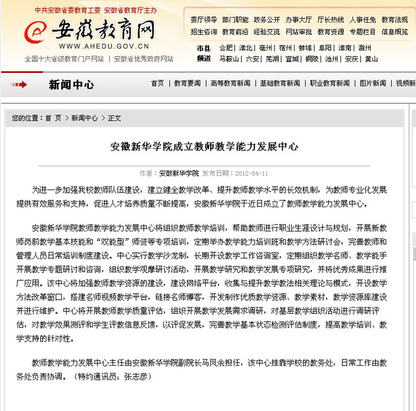 4月11日,安徽教育網(wǎng)首頁報道我校成立教師教學能力發(fā)展中心。
